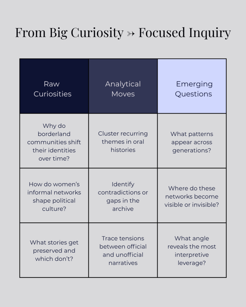 This structure does not require exactness at the start. Instead, it encourages you to engage with the material and observe its patterns, tensions, and gaps. Sorting information becomes attentive analysis. Let the archive, literature, and your curiosity interact until you shape your question. When it is fully formed, you will recognize it.